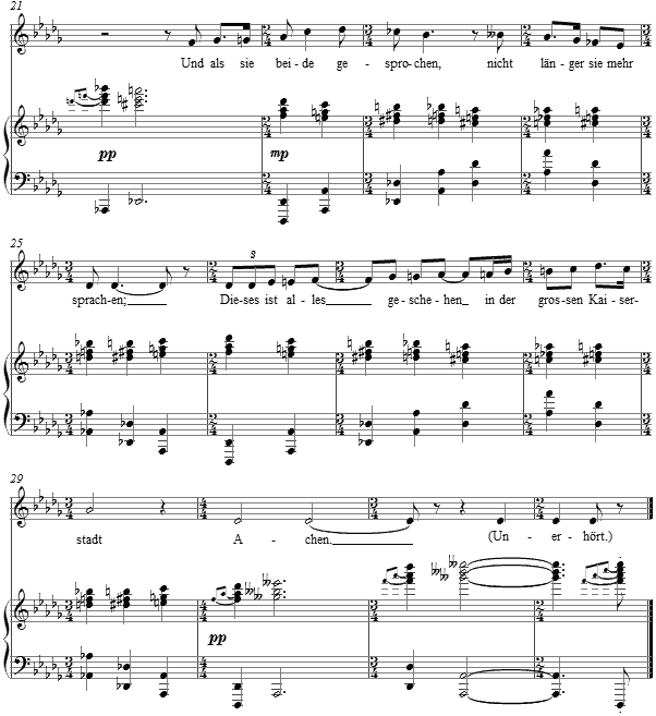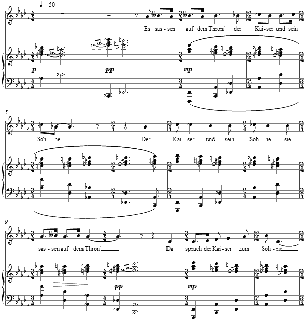 The bass is merely a succession of tonic and dominant, as the treble triads slip by half steps down from tonic to dominant and then rise again shaping small palindromes. Above this the vocal line in the first two strophes sketches out its own palindrome, twice the length of the accompaniment's.