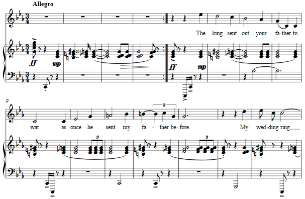 The last two lines of each stanza are treated as if a refrain. though the texts are each time new. Over the tonic minor outlined in the bass, the four triads traverse the entire twelve-tones, as C minor, E major in second inversion, D minor, and G-flat major in second inversion. Phrasing is as groups of two as the vocal line above conforms to the 3/4 meter. A short coda and last repetition of the text's "bring me the king’s head for reward." Such is the nature of those regimes throughout history which spawned an enemy by their actions.