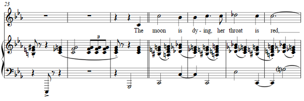 The opening gesture sets a lightly militant tone for this "cradle song." The chord successions used throughout are not functional but gestural, in the sense as Schoenberg used in his texts.