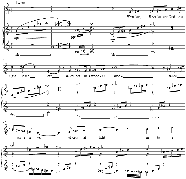 The score to Wynken, Blynken and Nod is available as a free PDF download, though any major commercial performance or recording of the work is prohibited without prior arrangement with the composer. Click on the graphic below for this piano-vocal score.