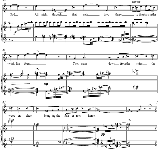 The setting of this poem wanders through several tonal domains, by the broad use of whole tone, polytonal and chromatic gestures. As with our own dreams which can meld many images together, this unease at resting in any tonal domain is a musical reflection of that penchant of the human mind. While the setting's first strophe hovers around A major and minor, this is not a necessary indication of what is to come.