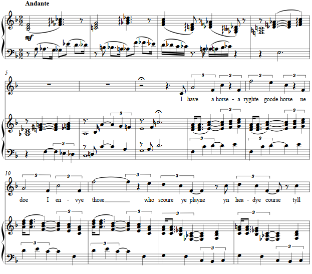The score for Ye Carpette Knyghte is available as a free PDF download, though any major commercial performance or recording of the work is prohibited without prior arrangement with the composer. Click on the graphic below for this piano-vocal score.