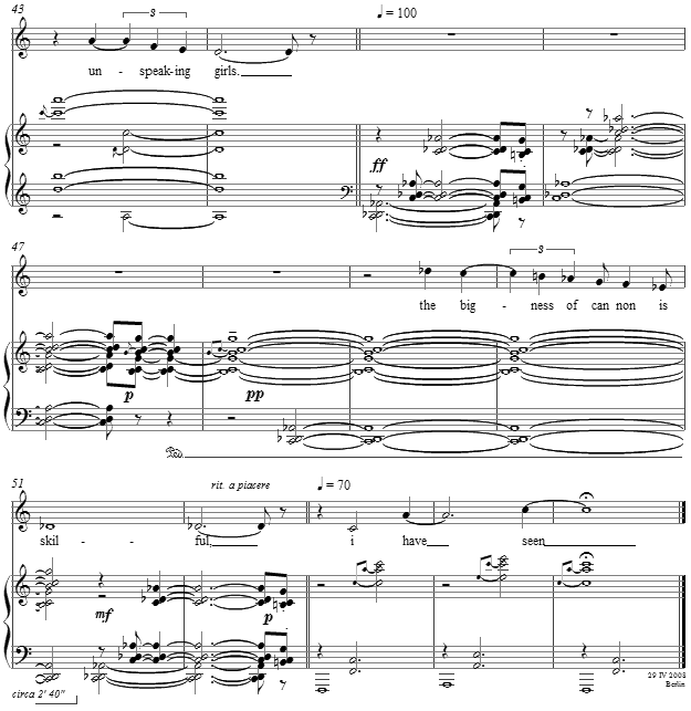The final repetition of the "bigness of cannon" is again answered with the phrase, now lingering in thought, that "i have seen...." In the human psyche, there are memories and visions of which one sometimes cannot speak -- or further speak. This is the intent of the last repetition and gesture. A musical setting of a poem such as this is, to this composer's view, more adapt at pointing to the "unspeakable" through the heightened power of singing the "unspeakable."